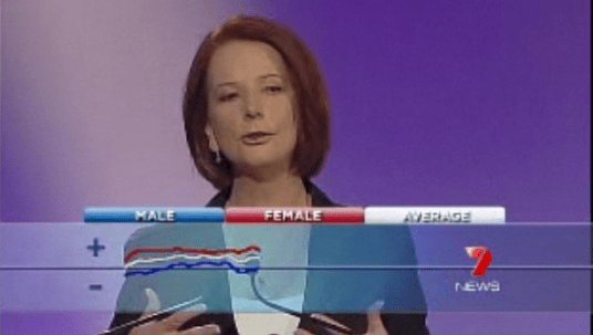 E’ una cosa davvero carina. In pratica, accanto alla stanza del dibattito, sono stati raggruppati diversi elettori appartenenti in egual modo ai due schieramenti politici. Erano dotati di uno speciale telecomando dove dovevano schiacciare bottoni con + o – nel caso in cui condividevano o meno quanto stava dicendo il politico. I risultati apparivano in tempo reale sotto forma di “biscia” o linea sotto il volto di chi stava parlando in quel momento. La biscia rossa rappresentava l’elettorato femminile, quella blu la maschile, quella bianca il risultato medio.