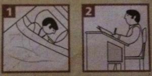 Perchè io sono quasi quasi tentata di rispondere che la frase si associa al disegno numero uno. Magari lo hanno fotografato tra un giro del letto e l’altro, è in preda all’ansia e all’insonnia e il fatto che ha gli occhi chiusi può trarre in inganno..